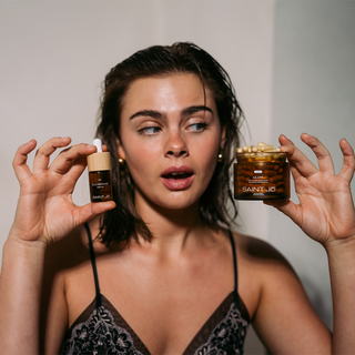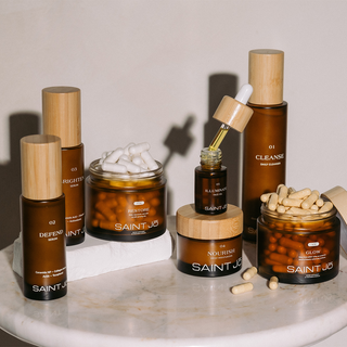 That gap led to SAINT Jō. We created a curated Skin + Within ritual that supports the skin externally while addressing internal balance through targeted supplements. This system-based approach, focused on barrier resilience and longevity.