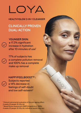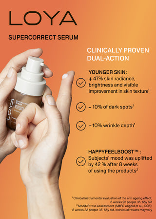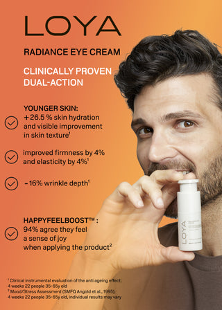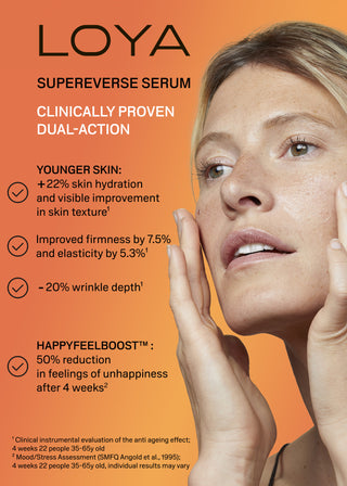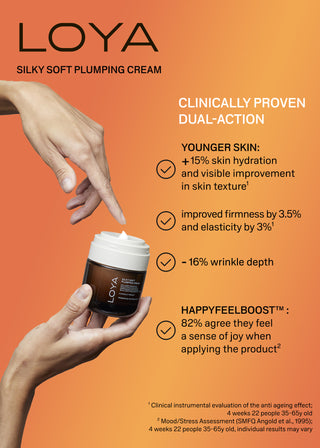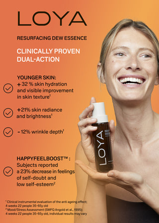 Yet LOYA didn’t stop there. LOYA scientists went one step further. Knowing that ageing also affects our emotions, energy, and state of mind, LOYA adds a second layer of care: Happyfeelboost™, a neurocosmetic technology that helps gently lift mood and reduce stress, turning each use into a moment of reset.