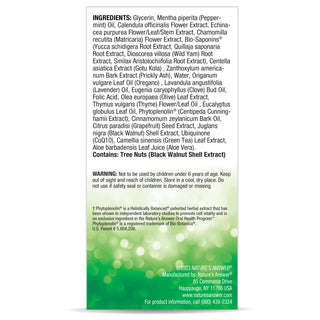 Glycerin, mentha piperita (peppermint) oil, calendula officinalis flower extract, echinacea purpurea flower/leaf/stem extract, chamomilla recutita (matricaria) flower extract, bio-saponins (yucca schidigera) root extract, quillaja saponaria root extract, dioscorea villosa (wild yam) tuber extract, smilax regelii root extract, centella asiatica extract (gotu kola), zanthoxylu americanum bark extract (prickly ash), water, origanum vulgare leaf oil (oregano), lavandula angustifolia (lavender) oil, eugenia caryophyllus (clove) bud oil, folic acid, olea europaea (olive) leaf extract, thymus vulgaris (thyme) flower/leaf oil, eucalyptus globulus leaf oil, phytoplenolin (centipedia cuninghamii), cinnamomum zeylanicum bark oil, citrus grandis (grapefruit) seed extract, juglans nigra (black walnut) shell extract, ubiquinone (coq10), camillia sinensis (green tea) leaf extract, aloe barbadensis leaf juice (aloe vera).