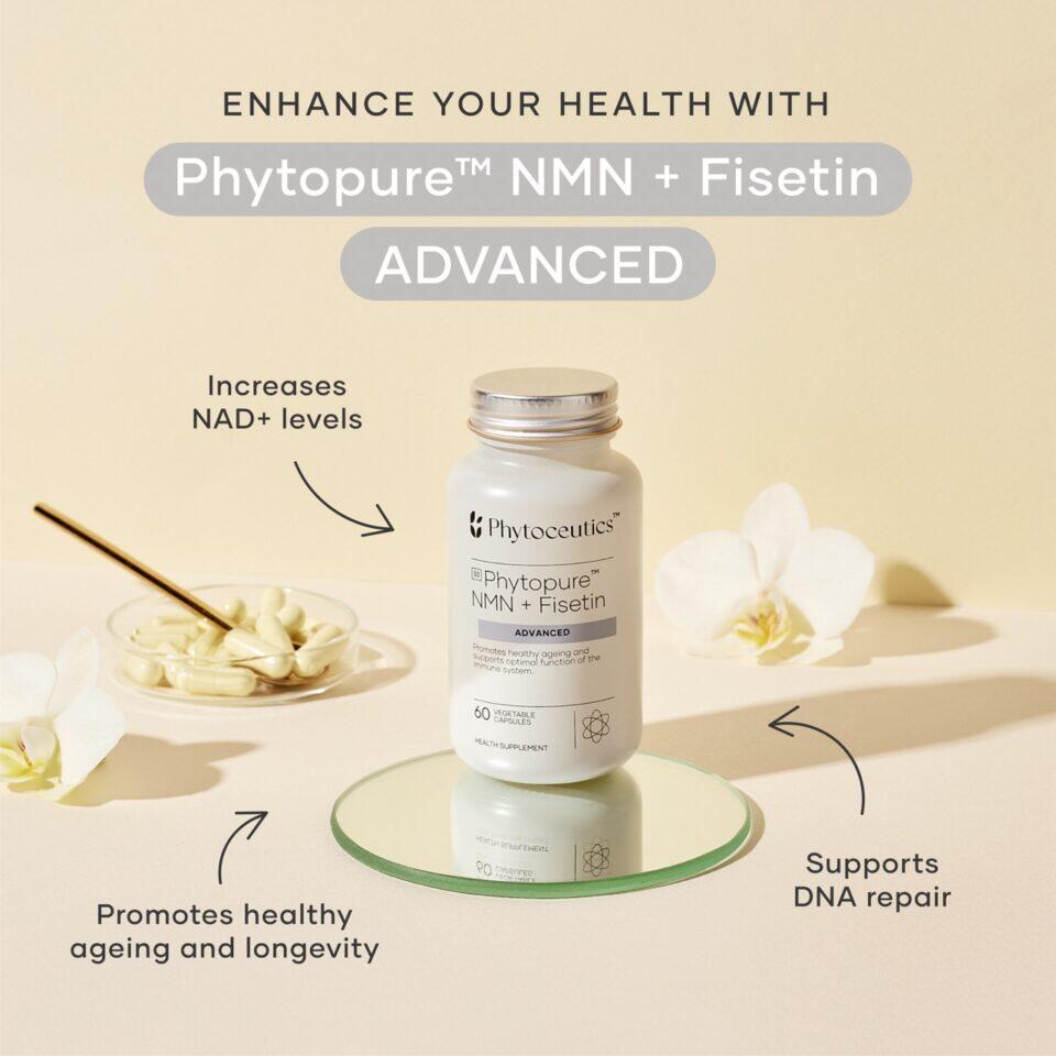 - Phytopure® NMN + Fisetin Advanced is an innovative healthy ageing supplement which provides 500mg NMN and 50mg Fisetin per capsule.