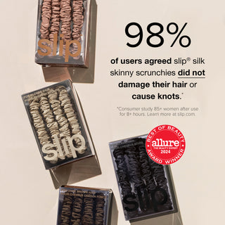 Traditional hair ties can tug on delicate hair which can lead to damage and breakage. Slip scrunchies are made with slipsilk, the same silk used in the award-winning slip pure silk pillowcase.