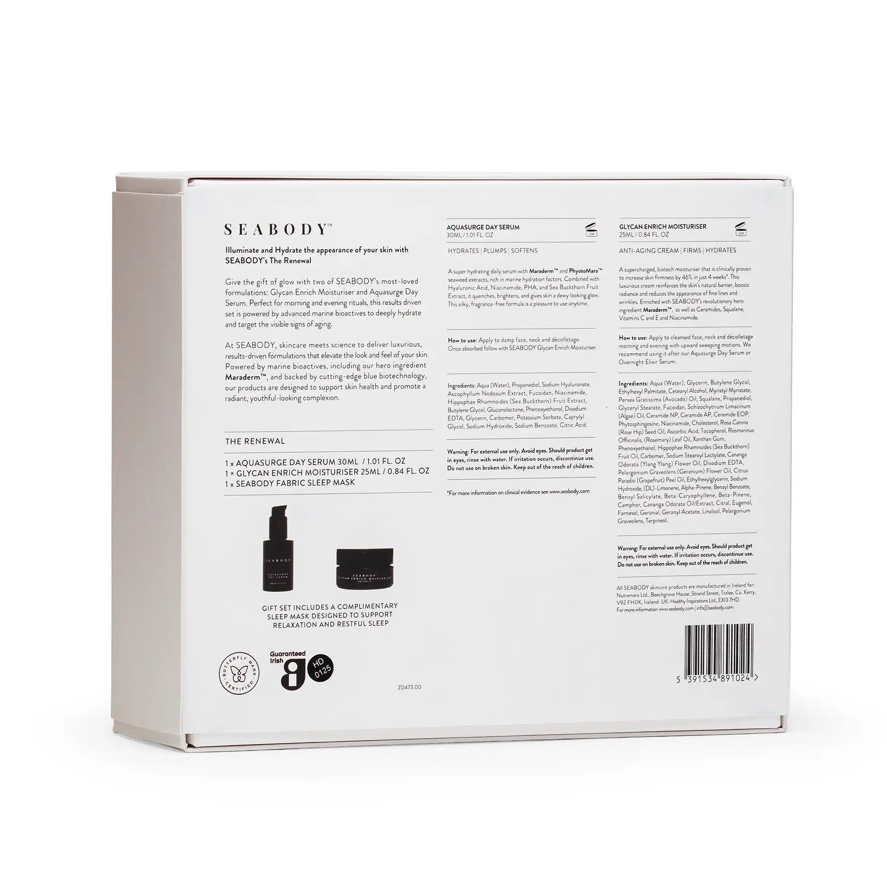 Aquasurge Day Serum: Maraderm | Hyaluronic Acid | Niacinamide | Seabuckthorn Fruit Extract, Aqua (Water), Propanediol, Sodium Hyaluronate, Ascophyllum Nodosum Extract, Fucoidan, Niacinamide, Hippophae Rhamnoides (Sea Buckthorn) Fruit Extract, Butylene Glycol, Gluconolactone, Phenoxyethanol, Disodium EDTA, Glycerin, Carbomer, Potassium Sorbate, Citric Acid, Caprylyl Glycol, Sodium Hydroxide, Sodium Benzoate.